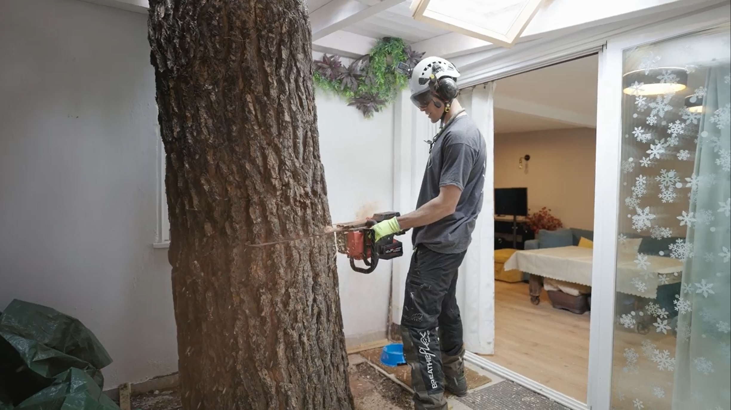 Projekti testasi sekä kalustoa että ammattitaitoa. Tiheästi asutulla alueella tiimi kohtasi tiukat melurajoitukset ja korostuneet turvallisuushuolet. Puu kasvoi keskellä suljettua sisäpihaa, mikä vaati erityistä tarkkuutta sekä rakennuksen sisä- että ulkopuolella.